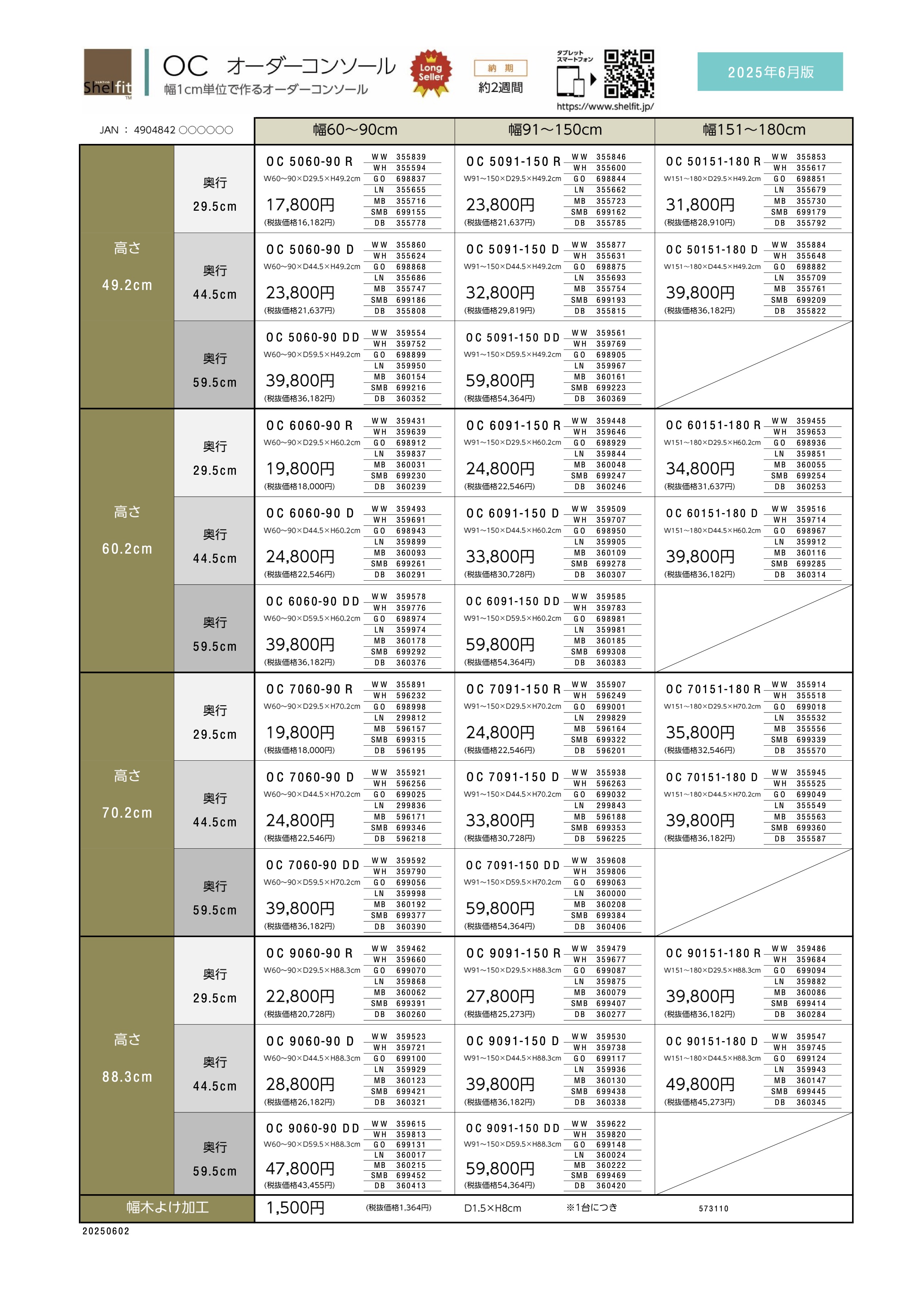 | ● 材質:天板ポリエステル樹脂塗装・ダップ樹脂等 ● 商品サイズ 幅60~180cm(1cm単位オーダー) 奥29.5・44.5・56.5cm 高49.2・60.2・70.2・88.3cm ●色:ホワイトウッド・ホワイト・ライトナチュラル ミディアムブラウン・ダークブラウン ● 商品価格:17,800.-(税込)~ |